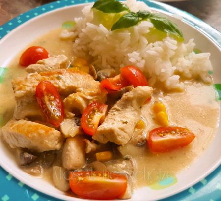 Hallo Ihr Lieben, ich habe zusammen mit Matheo ein schnelles Rezept für Euch, Putengeschnetzeltes mit Reis in Soja Sahne dazu habe ich ein paar frische Cherry Tomaten und Mais mit in das Geschnetzelte gemacht. Es passt perfekt dazu und wir essen es hier sehr gerne.
