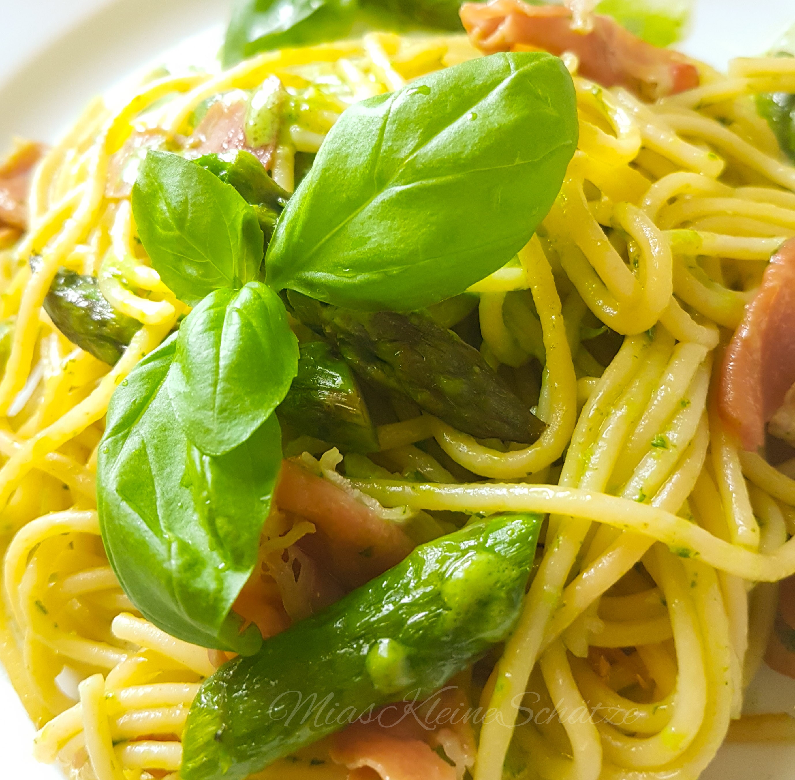 Rezept: Pasta mit grünem Spargel, Serano Schinken & Pesto