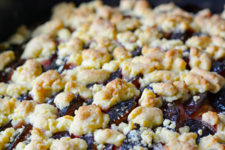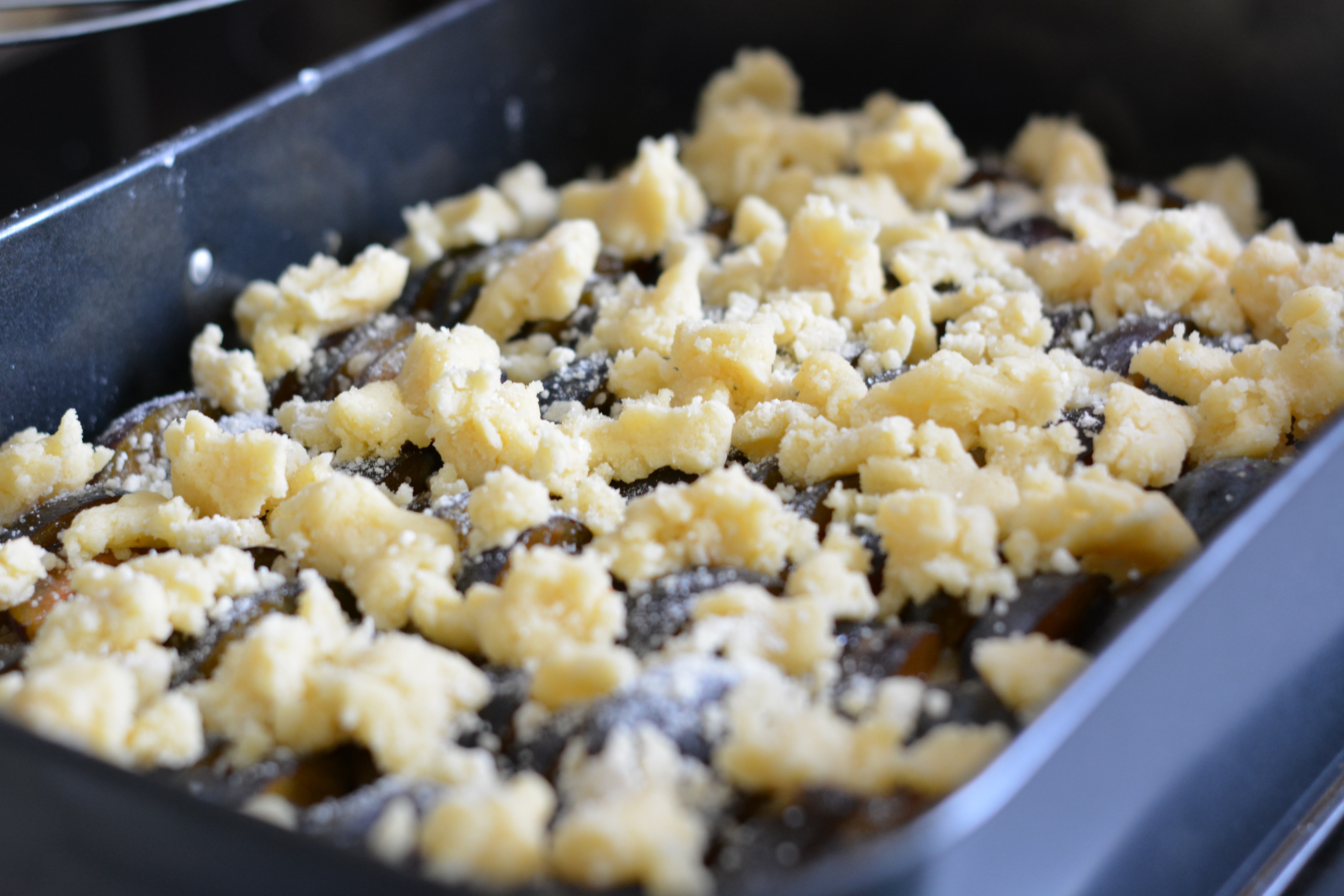 Die Streusel auf dem Pflaumenkuchen nach Belieben verteilen und den Kuchen für 25 Minuten goldbraun backen.