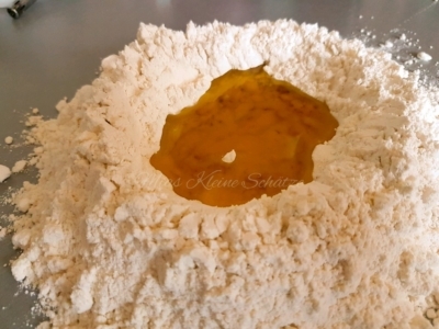 Die Hefe in einem Messbecher mit dem Zucker, ca. 150 ml lauwarmes Wasser auflösen und für 5 Minuten stehen lassen.