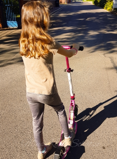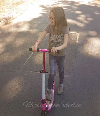 Stella hat demnächst ihre Fahrrad Prüfung und wollte sich ein wenig vom Lernstress erholen und ist mit dem Roller durch die Gegend gefahren. Gut wenn man dann einen Roller für Große hat. Der Roller ist bei uns auch wirklich oft im Einsatz, dass wisst ihr bestimmt von meinen Beiträgen der letzten Monate. Auch ich bin mit dem Roller schon oft gefahren. Denn Matheo will ja wie seine großen Schwestern alles mitmachen und so nehmen sie ihn schon mal auf dem Scooter mit. Der Scooter ist von Authentic Sports und sehr leicht, lässt sich einfach zusammen klappen und ist bis 100kg belastbar. Am besten finde ich, den höhenverstellbaren Lenker, so lässt sich der Scooter ideal für die Größe des Kindes einstellen. Was mich ein wenig stört ist, dass die Kinder es nicht alleine schaffen den Roller auf ihre Höhe einzustellen. So müssen wir mit Thomas immer mit der Einstellung helfen. Der Knopf zum Einstellen der Höhe lässt sich schwer hineindrücken und man braucht schon etwas Kraft zum Verändern der Höhe. Ansonsten muss ich wirklich sagen, dass wir mit dem Scooter von Authenic Sports sehr zufrieden sind.